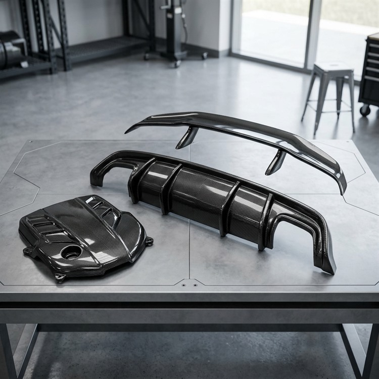 際立つカーボンテクスチャ、精密なコンポジット構造、そしてプレミアムなエクステリアディテールを備えた、軽量化が求められる自動車向けのカスタムカーボンファイバーエアロカナードセットソリューション。