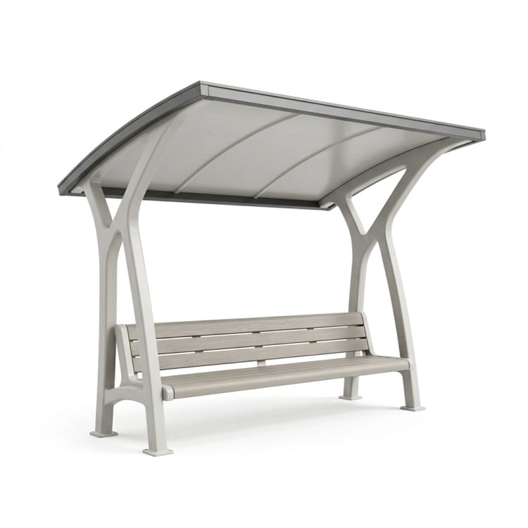 曲面状の保護キャノピーを備え、都市景観に合わせたカスタマイズが可能な、屋外レジャーエリア向けのFRP製公園ベンチシェルターソリューションです。